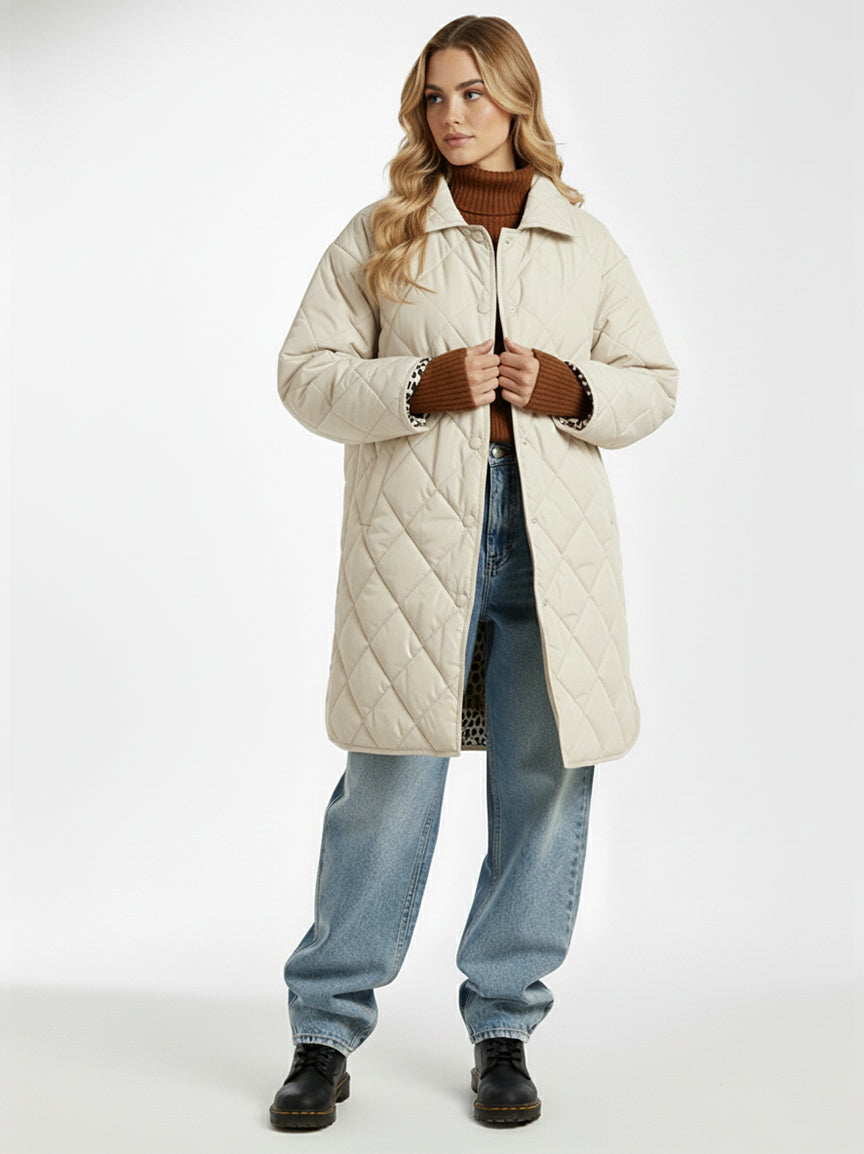 Descubre nuestro abrigo LIDIA, un abrigo acolchado reversible que fusiona la elegancia clásica con un toque audaz. Su exterior minimalista y sofisticado oculta un forro de leopardo lleno de personalidad, que puedes mostrar a tu gusto: en los puños para un detalle sutil o completamente para un look más atrevido. Perfecta para los días de otoño e invierno, te envuelve en calidez mientras resalta tu figura con estilo.